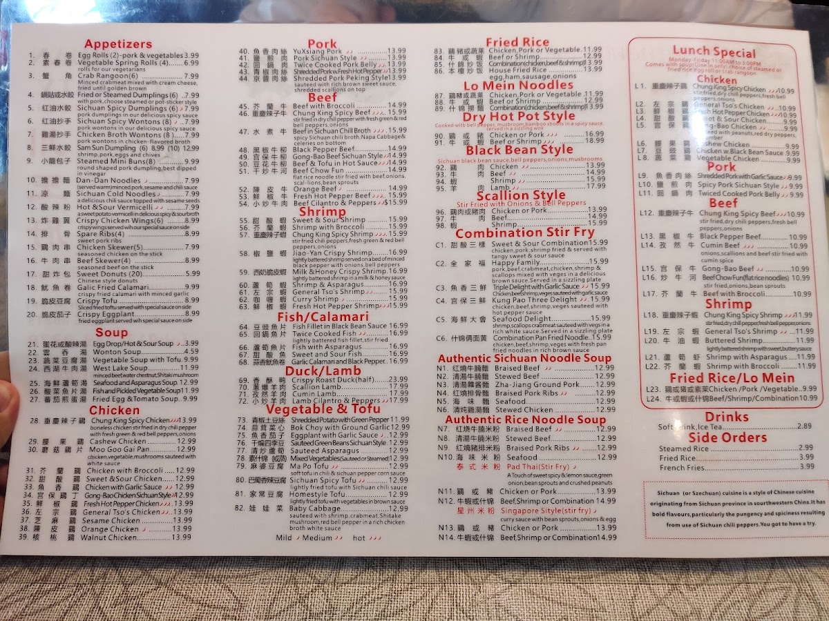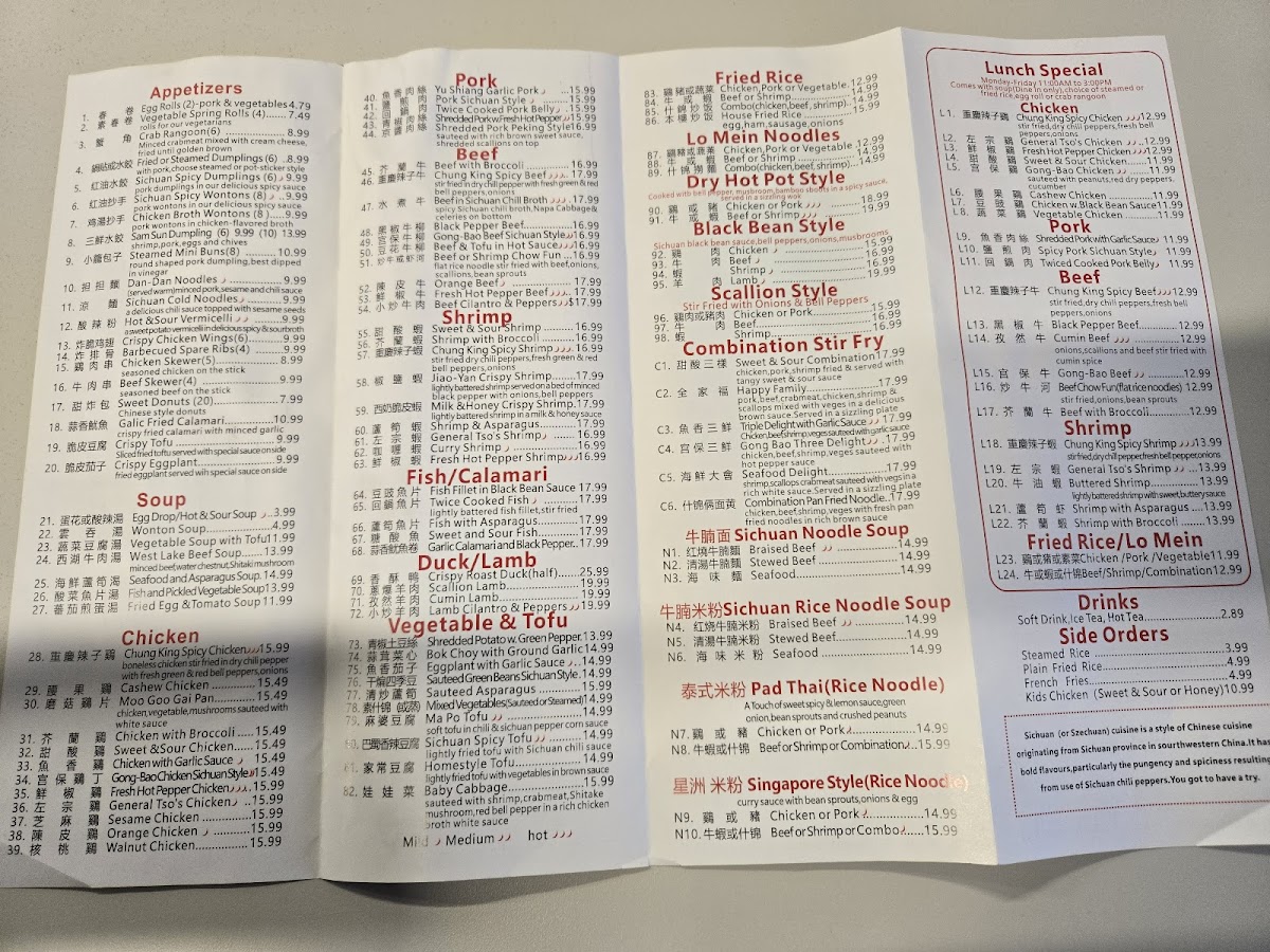 The highlight of their offerings includes the Sichuan Rice Noodle Soups, featuring braised beef, stewed beef, and seafood options, each priced at $15.99. For meat lovers, the Pork in Sichuan Chili Broth ($17.99) and Twice Cooked Pork Belly ($16.99) pack a flavorful punch, showcasing the depth of Sichuan spices.